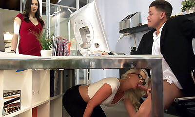Slutty assistant gives her boss a blowjob under the table